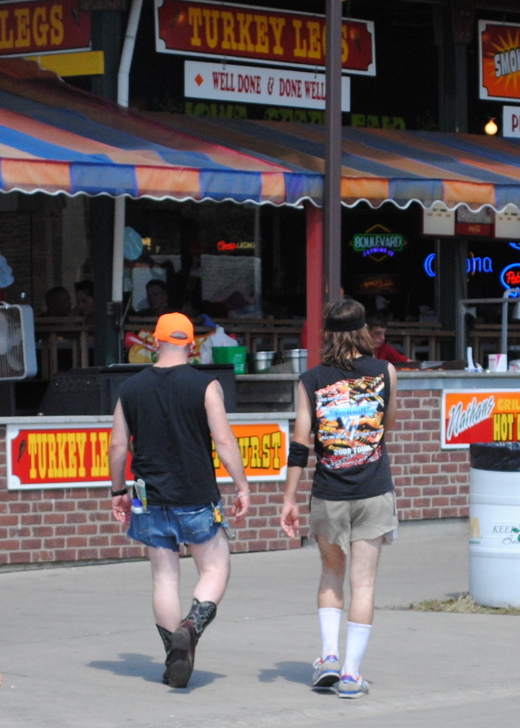 It was a twilight zone of meat: pork, steak, chicken, turkey, bacon, sausage, meatballs, 1/2 lb tenderloins, hamburgers. And it seemed that every other person I saw was a walking example of what happens if one eats state fair food as one’s daily diet. The people watching just got better and better and more alarming as we made our way around the fair. (Picture the humans in the movieWall-E.) I couldn’t snap my camera fast enough. In speaking with one seemingly regular gentleman, he asked me what I was doing with the big camera. I told him that I was photographing state fair food. He asked me, “are you taking pictures of all the freaks?” Yes, yes, I was. I couldn’t keep my shutter shut.
