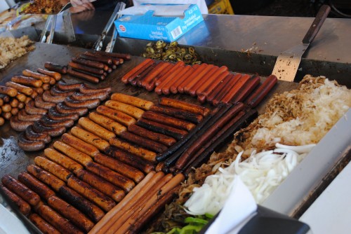 We were also lucky enough to catch a few of the animals left in their pens, including a gigantic pig that looked like a hippopotamus, sheep, goats, turkeys, ducks and cows. The smell, oh the smell, can only be described as hot and pungent. And most likely, very soon, these animals would be on a stick somewhere. Gross.